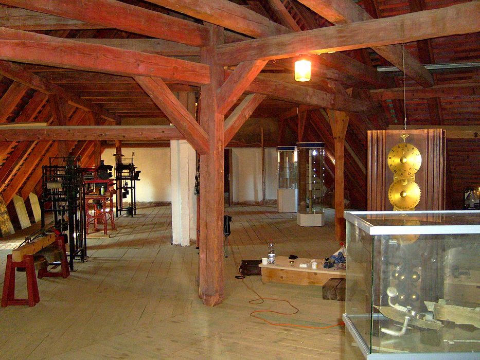 Fotografické výstavě 600 let Pražského orloje pana Marušáka se v prostředí starých hodinových strojů dobře daří. Zcela vpravo stroj z evangelického kostela v Podmoklech